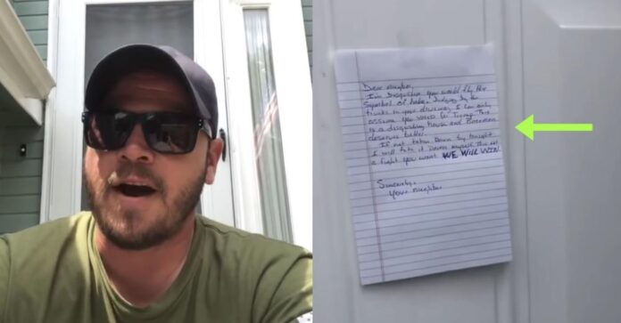 The letter continued: “If not taken down by tonight, I will take it down myself. This is not a fight you want. We will win. Sincerely, your neighbor.”